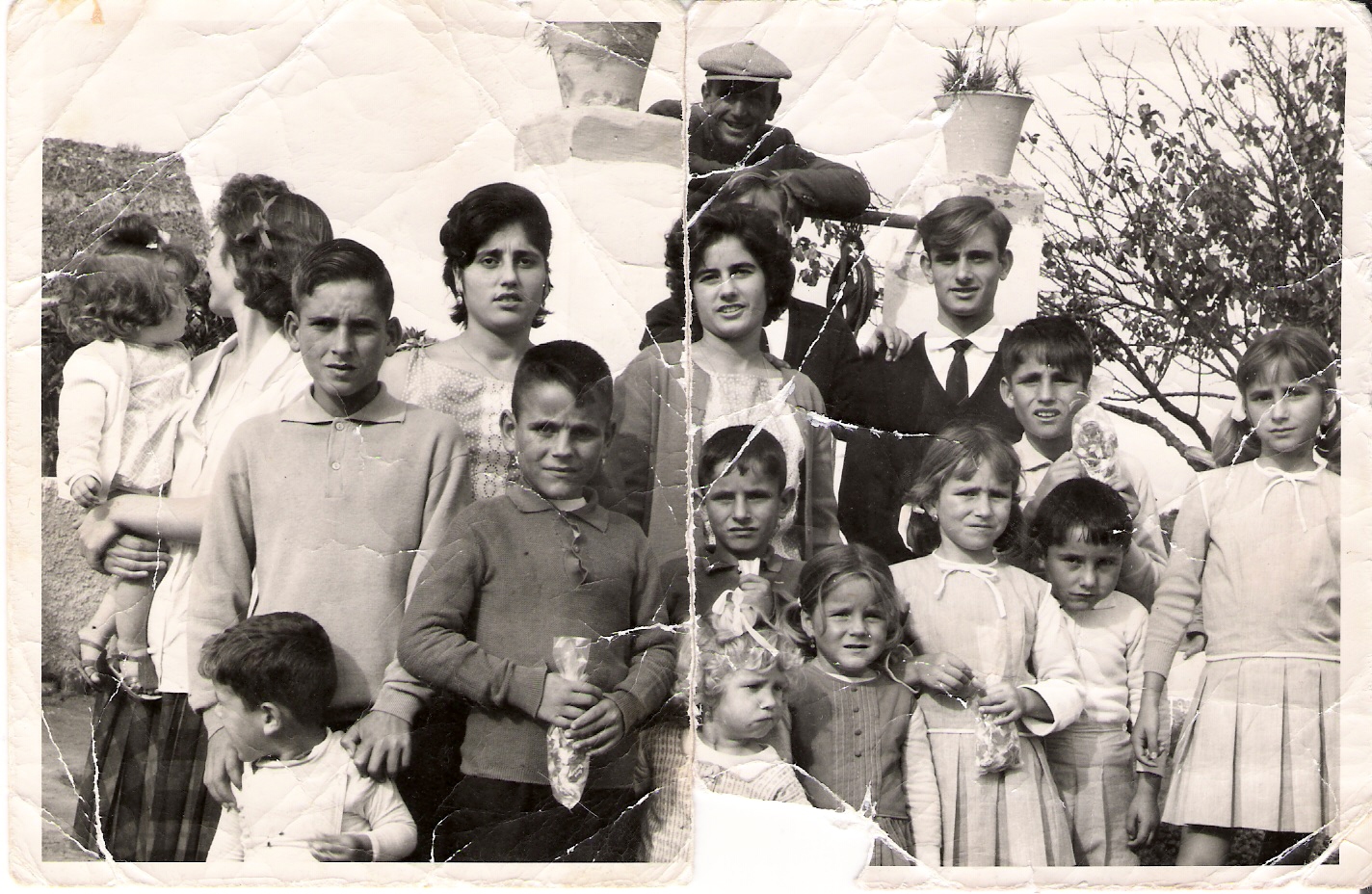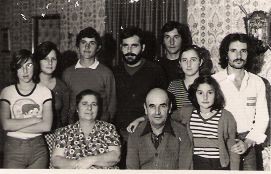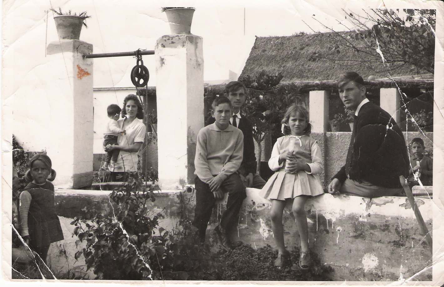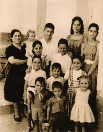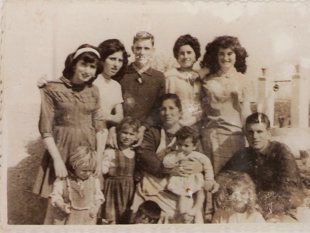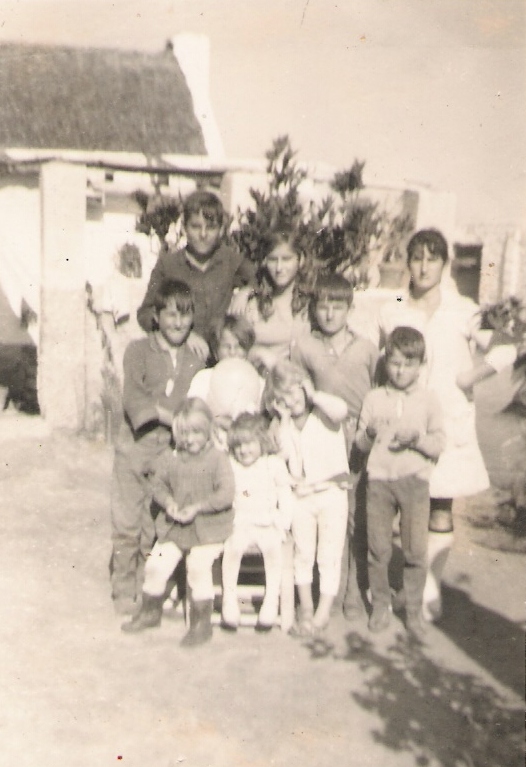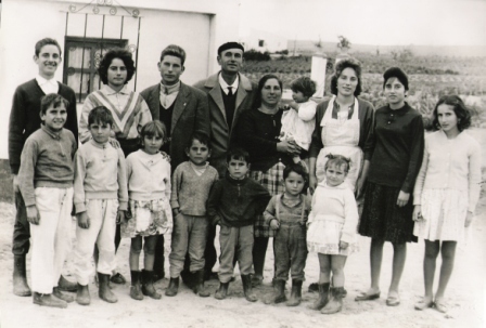 Foto familiar realizada posiblemente sobre octubre de 1962, cuando eran 14 hermanos y vivían en el Pago San Jerónimo, de izquierdas a derecha: Antoní, Cariri, Manolín, en el centro Matrimonio Manuel y Rosario que tiene en brazos a Mila , Rosarito, Cuqui y Vitorina. Delante tenemos a: Rafalín, Ricardo, Carmelú, Pepe, Paco, Juani y Esperanci.