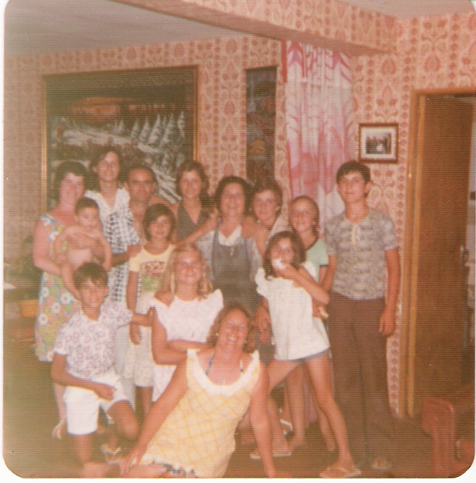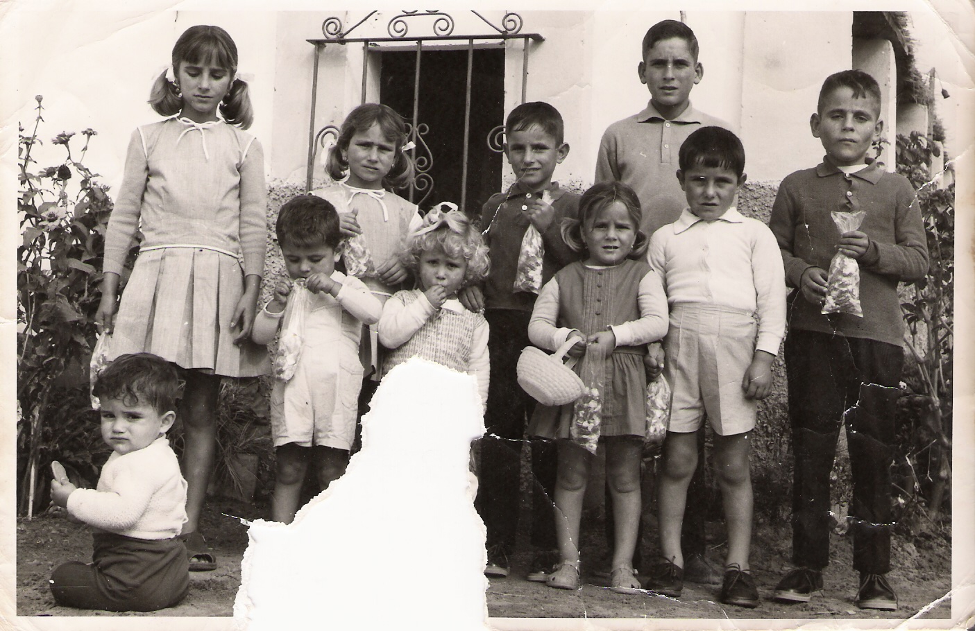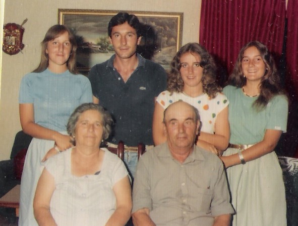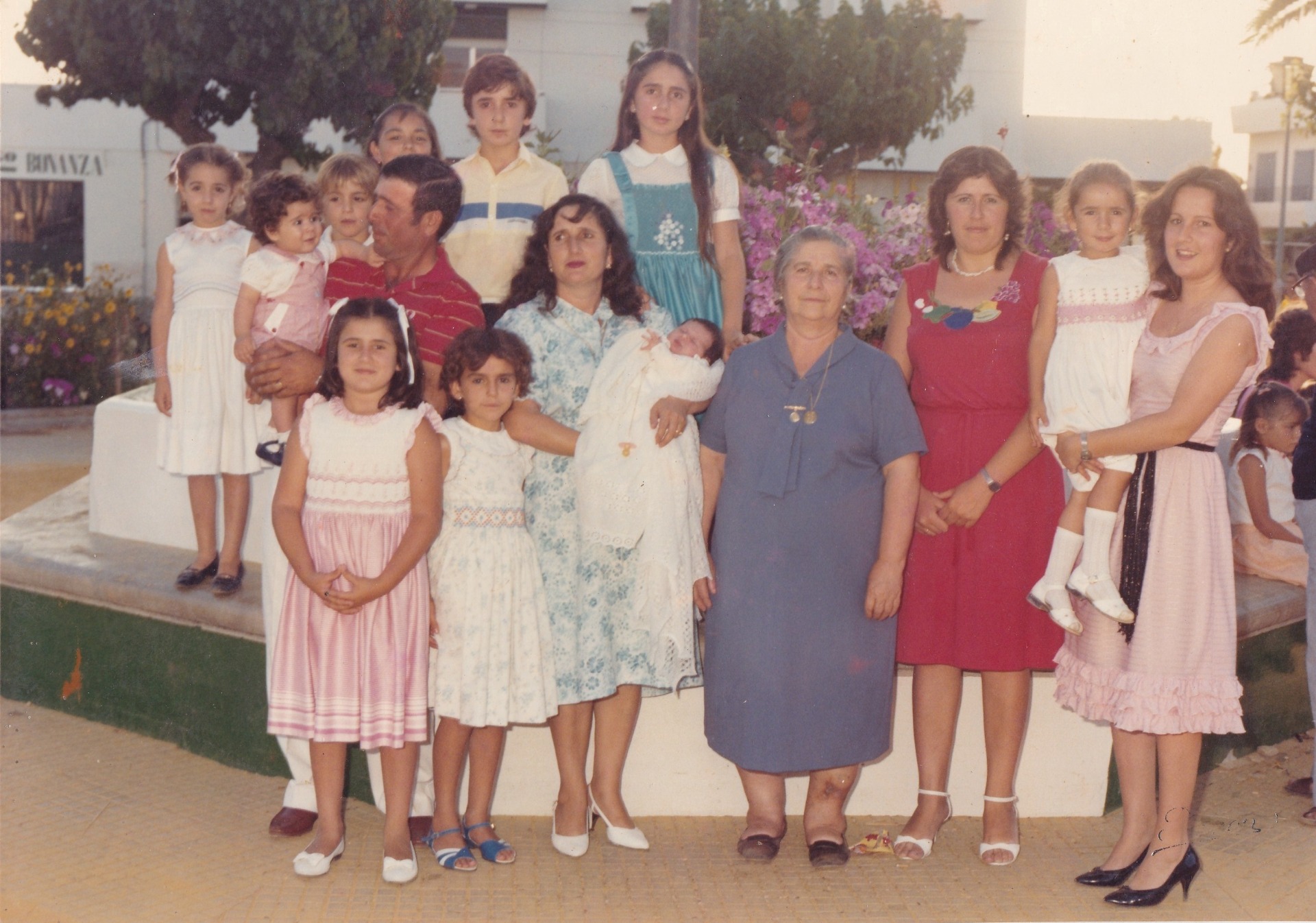 Foto familiar realizada posiblemente sobre octubre de 1962, cuando eran 14 hermanos y vivían en el Pago San Jerónimo, de izquierdas a derecha: Antoní, Cariri, Manolín, en el centro Matrimonio Manuel y Rosario que tiene en brazos a Mila , Rosarito, Cuqui y Vitorina. Delante tenemos a: Rafalín, Ricardo, Carmelú, Pepe, Paco, Juani y Esperanci.
