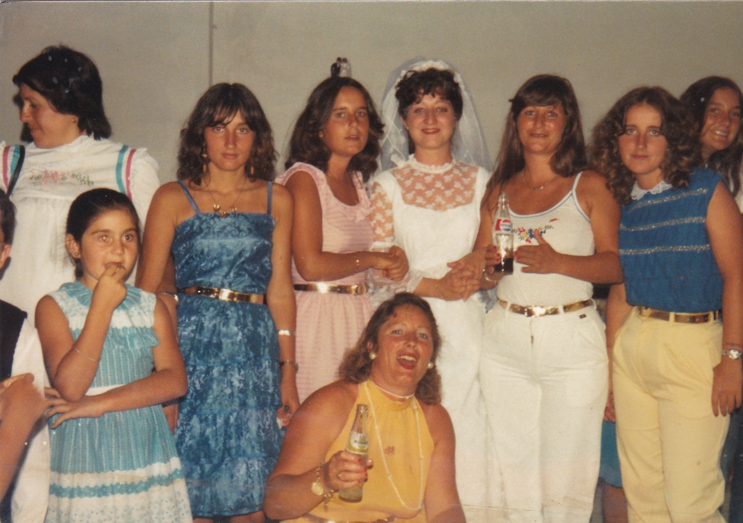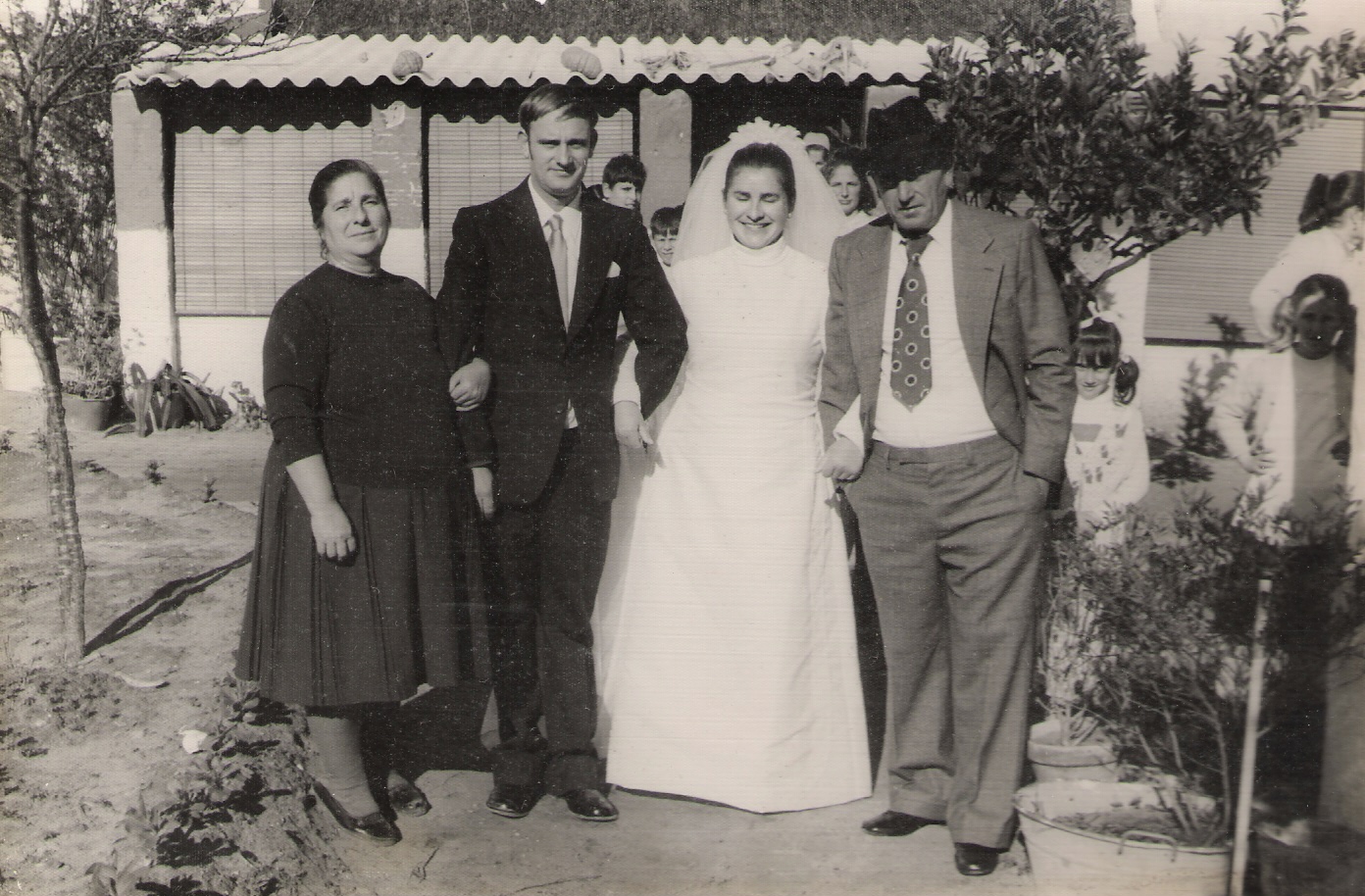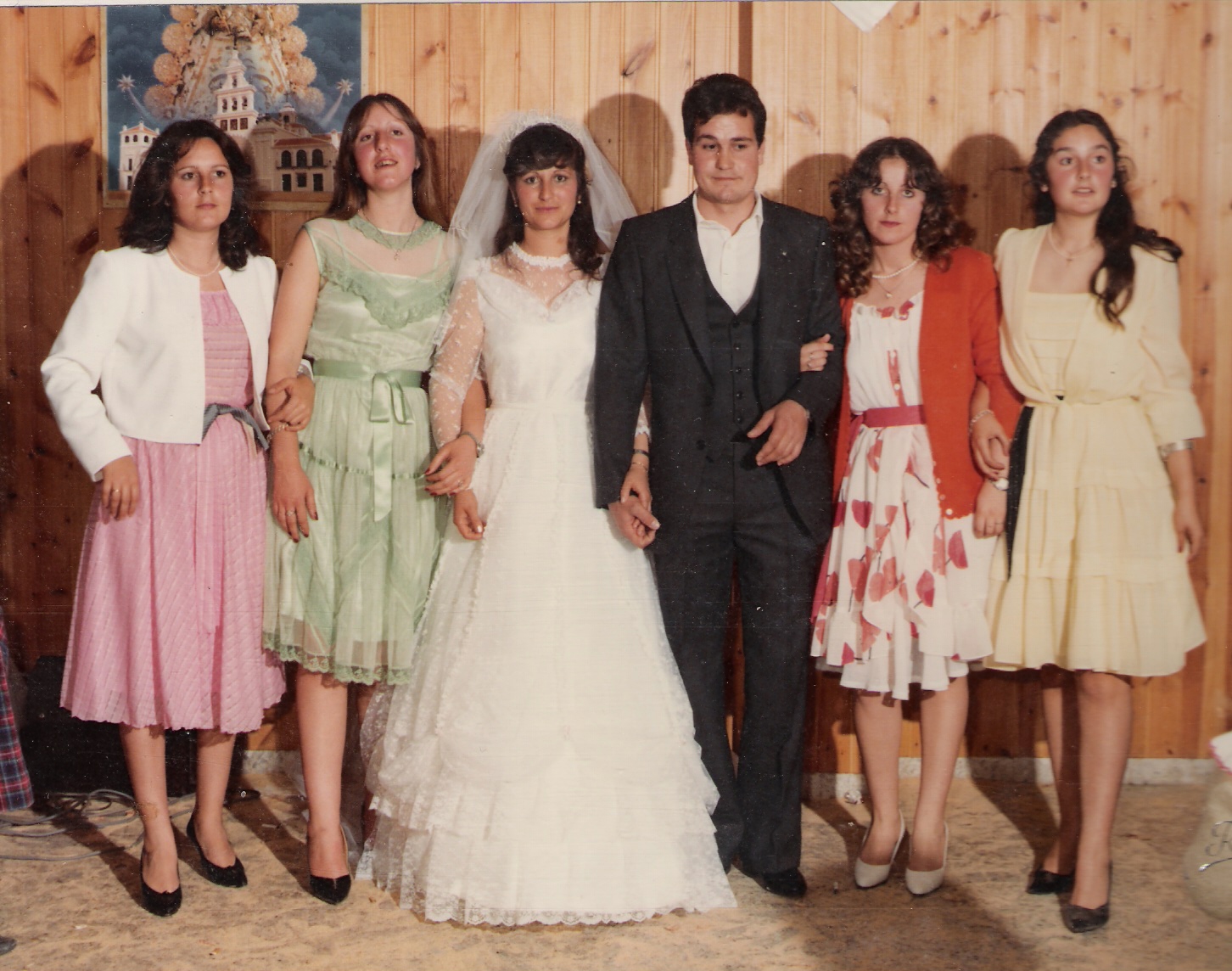 Boda de Antonio y Mila en la que posan con el recien matrimonio las hermanas (de izquierdas a derecha)...Pepi, Merchi y Conchi.