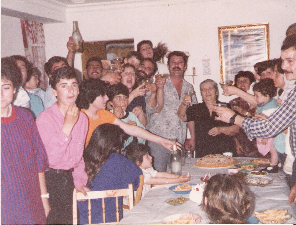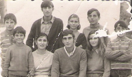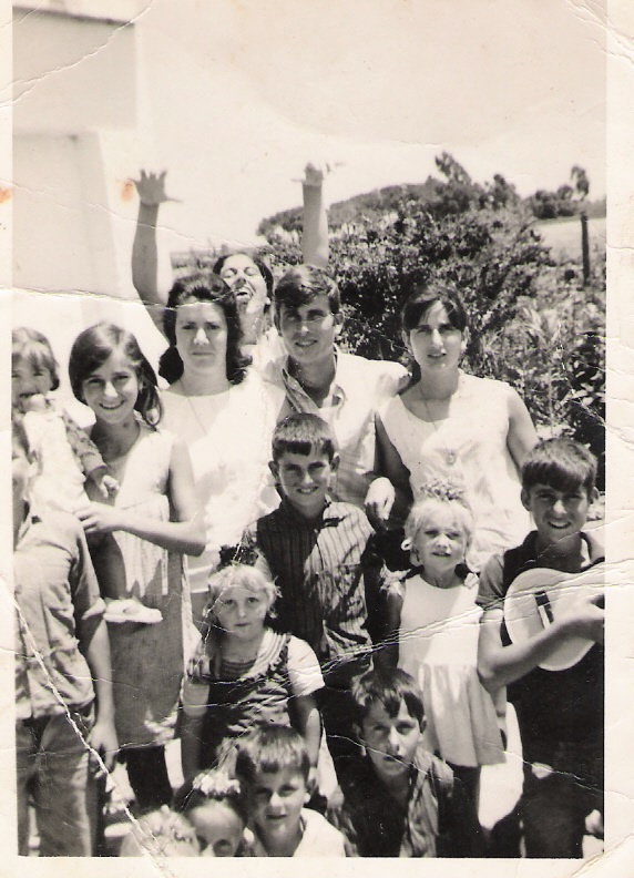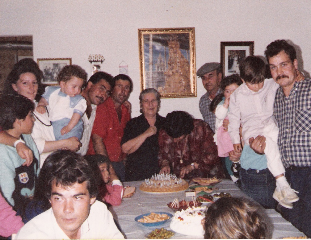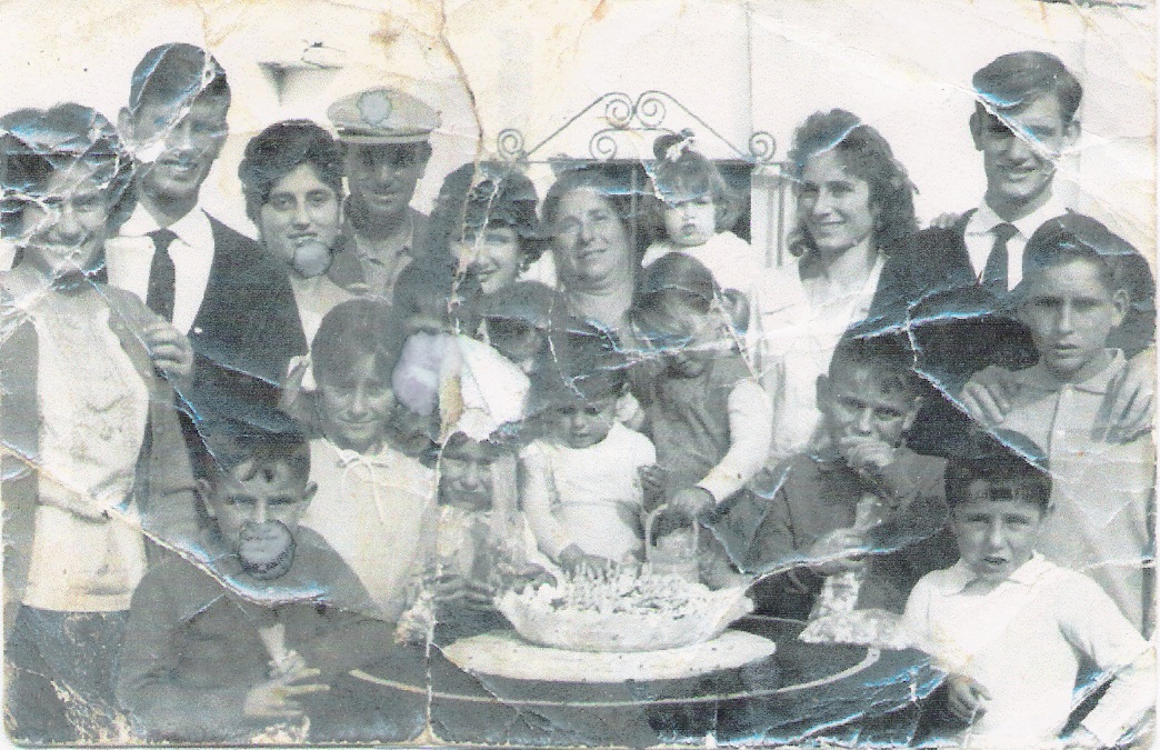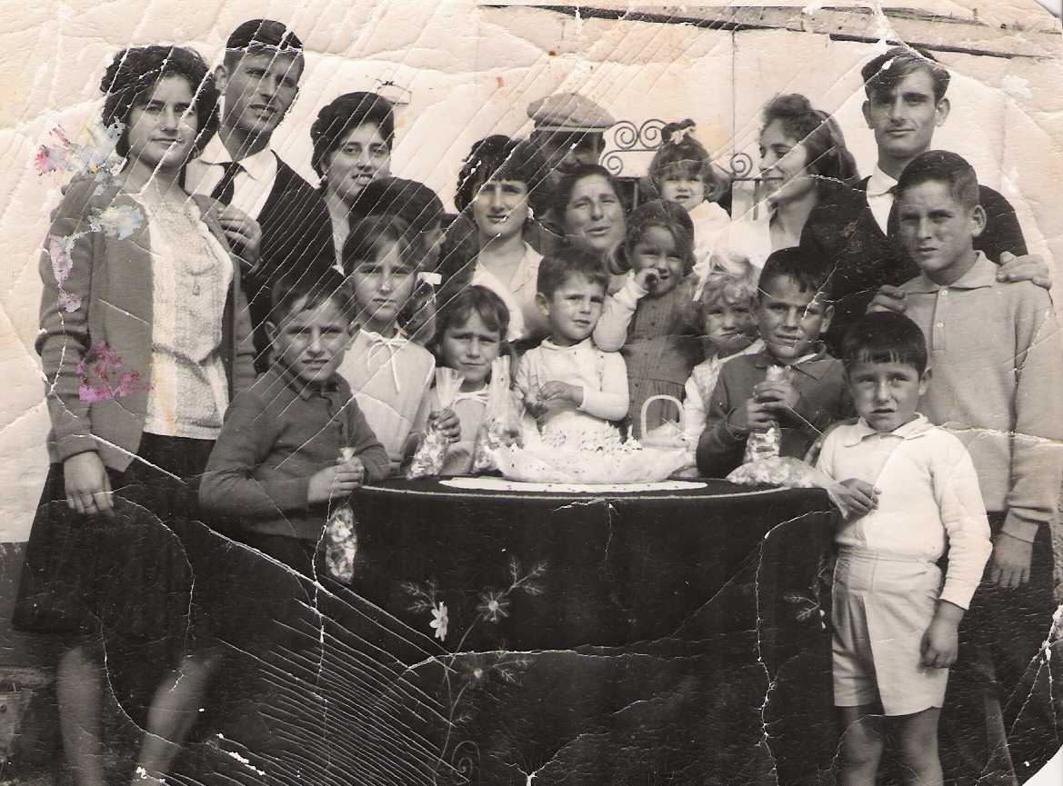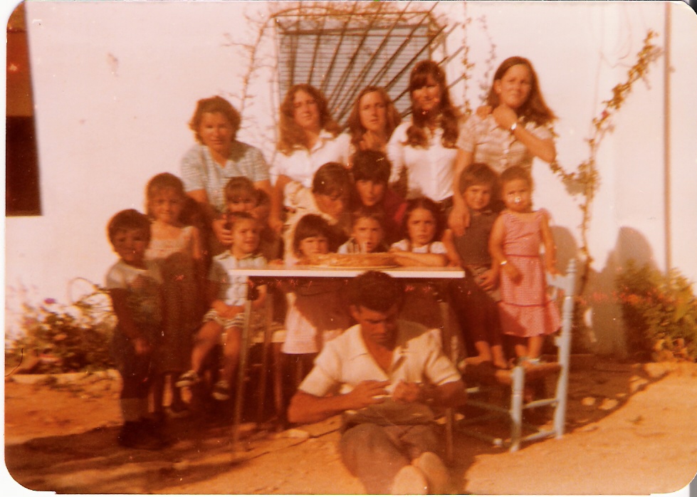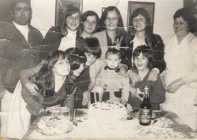Celebrando el cumpleaños de Juan Manuel, hijo de Cariri y Paco. En la foto podemos observar en el centro a las chicas más pequeñas de la familia Catapez. De izquierdas a derecha y de arriba hacia abajo son: Paco Salazar, Pepi, Conchi, Mila, Carmelú, Cariri y abajo Cari, Merche, Francis, Juan Manuel y Conchi.